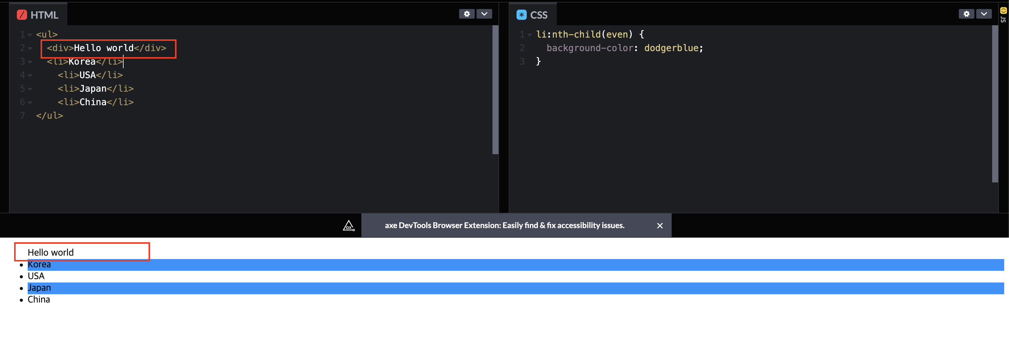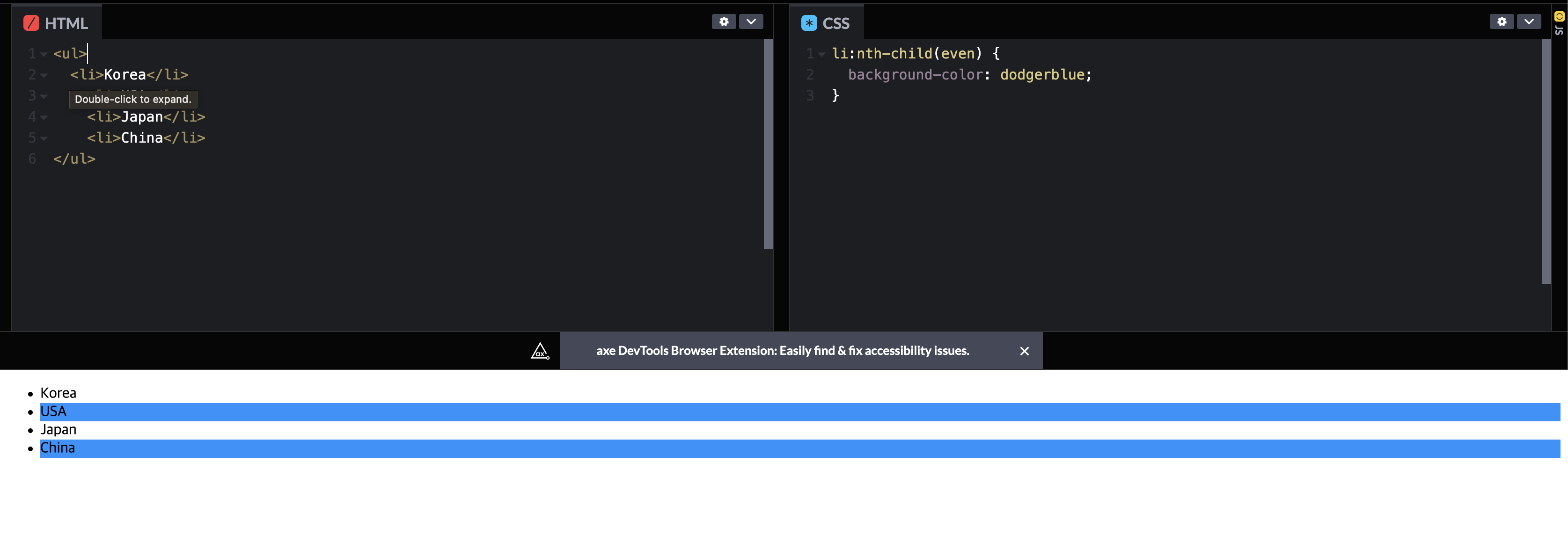 국가 리스트에서 짝수 번째 있는 나라에만 배경색을 추가하려 했지만, div요소가 상위체 추가되면서 의도와 다르게 코딩 되었다.