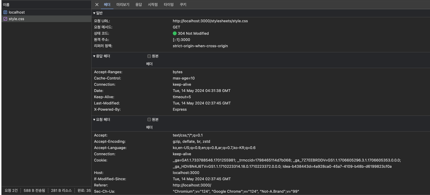 확인해보니 캐쉬가 되고 있다. 이유는 브라우저가 첫번째 요청 때 Last-Modified를 받았기 때문에 If-Modified-Since 해더를 추가해서 요청해서 서버로 부터 304 Not-Modified를 받았기 때문이다.