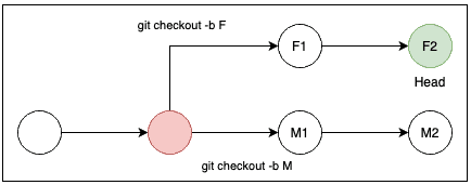 여기서 알아야 할 사실은, M branch로 checkout해서 확인해보면 F1, F2에서 커밋했던 내용들이 없다는 것이다.